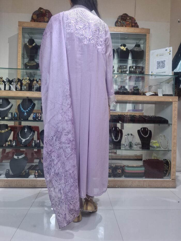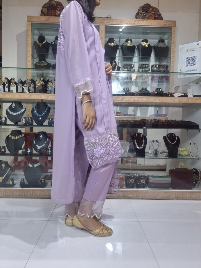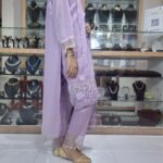 Beautiful lavender suit with contrast cutwork embroidery patch